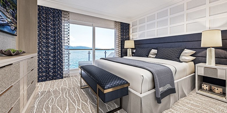 The luxurious Grand Suites are among the finest accommodations afloat with an unprecedented 620-square-feet of personal space. Each suite has a living room, bedroom, interior and exterior dining areas, and a spacious master bathroom. Floor-to-ceiling sliding glass panels in both the bedroom and living room are a feature of the room and lead to a 25-foot-long private balcony with a table, chairs, and chaise lounge. The living room has a full-size couch and 60” inch TV, while the dining area has ample counterspace with replenished treats and a stocked refrigerator. The master bedroom has an additional 60” TV and is available in king size or two twin bed configurations. The master bathroom has a double vanity with a large shower. Additional amenities in each Grand Suite include an oversized double wardrobe, underbed suitcase storage, drawer and cabinet space, writing desk, plush robes, safe, and complimentary WiFi.