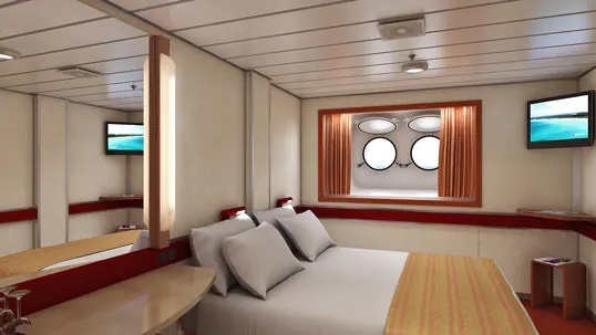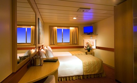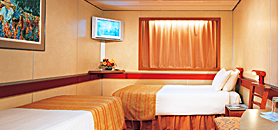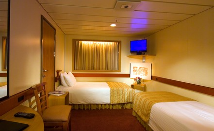 Interior staterooms are excellent vacation values. These spacious accommodations include most of the same generous amenities as their ocean-view neighbors. Some even feature an extra pull-down bed, which makes these staterooms ideal for families. All staterooms have carpeting, ample drawer and closet space, private facilities (shower, basin and toilet), telephone and color television showing first-run films. Our SuperLiners all feature staterooms above ocean level for a more comfortable cruise. Twin beds can be converted to a queen/king configuration.